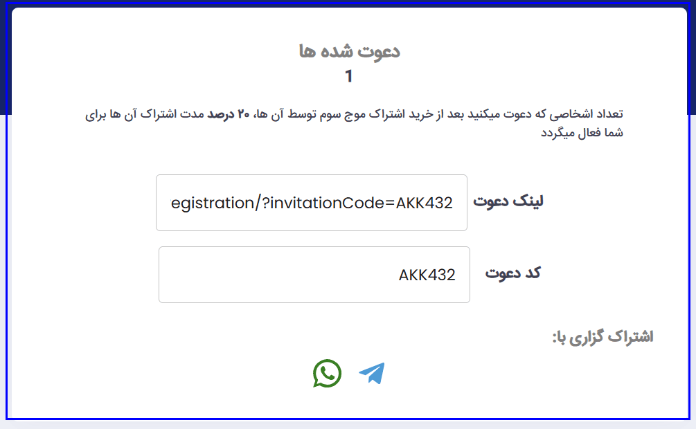 پس از ثبتنام افراد و خرید اشتراک موج سوم توسط آنها، بهطور خودکار ۲۰ درصد به مدت اشتراک آنها افزوده میشود و دعوت شما نیز به عنوان یک دعوت موفق ثبت میگردد.